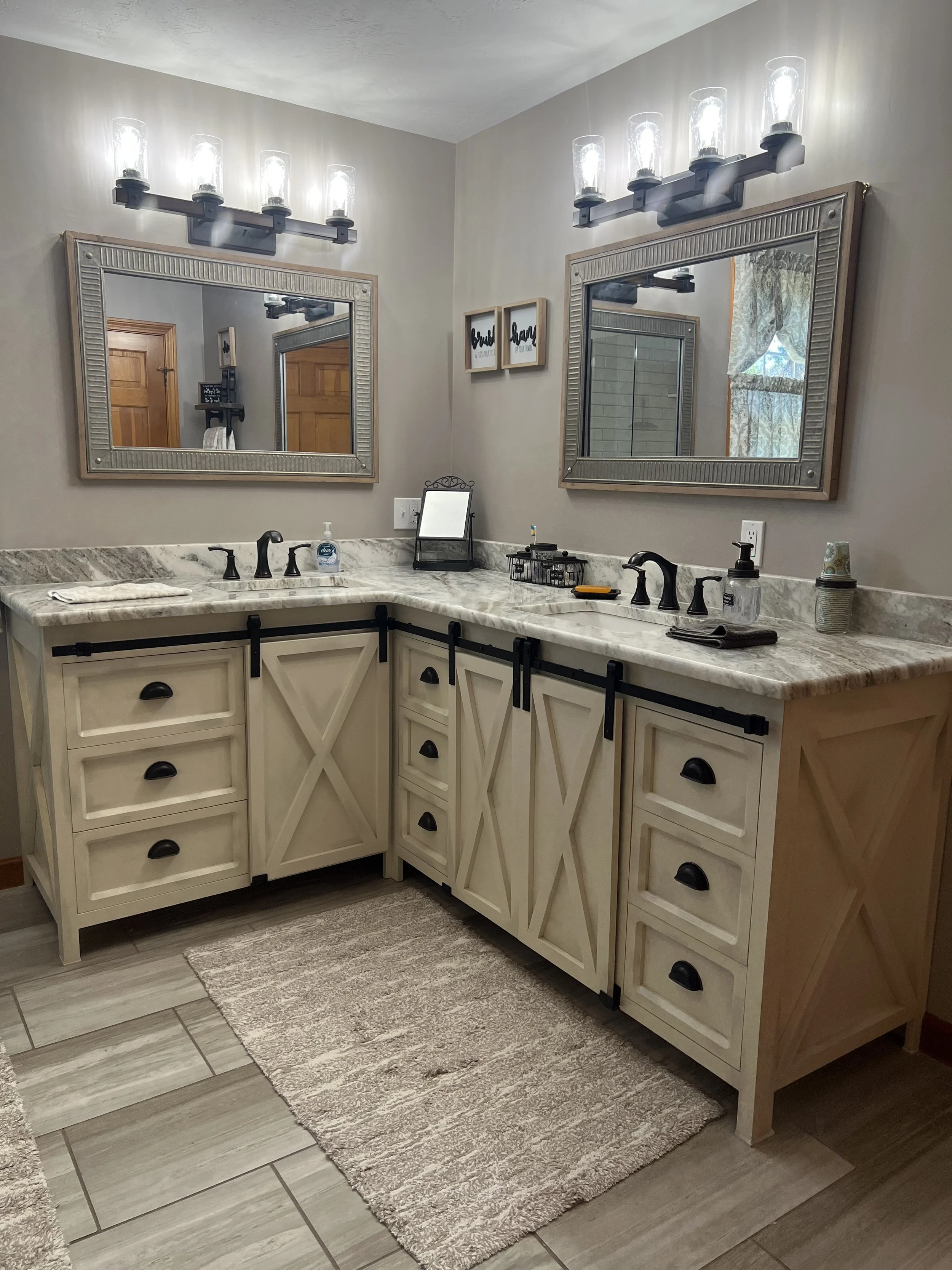 Vanities can be finished in the stain or paint color of your choice, and we also offer distressing of the finish. Multiple coats of polyurethane is used to finish off the vanity for durability and longevity of color.